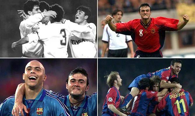 1996年,诺坎普的夏风中,恩里克迎接的并不是热烈的欢迎,而是冰冷的敌意。作为克鲁伊夫时代的功勋,许多巴萨人视他为“间谍”,球迷们更是高喊“马德里来的骗子”。但他凭借着坚韧不拔的意志,打破了这层冰封:300次出场、108粒进球,他像万金油一样在各个位置上填补战术空缺——从右前卫的冲刺,到中场的拦截,再到前锋位置的致命一击。